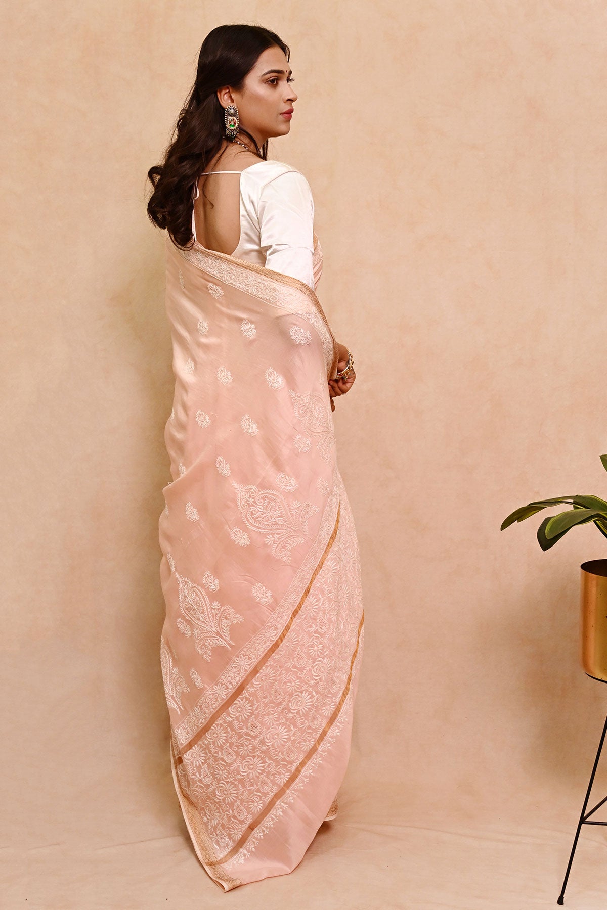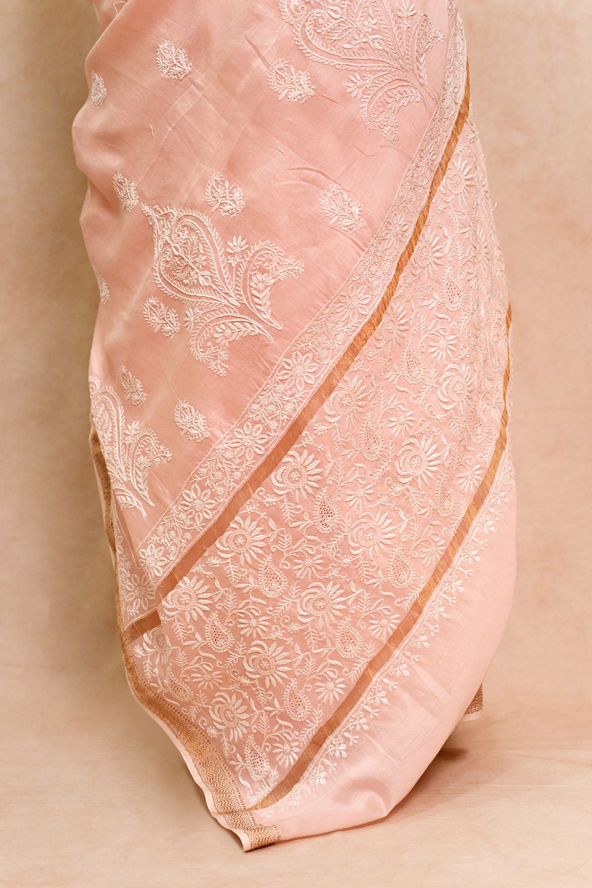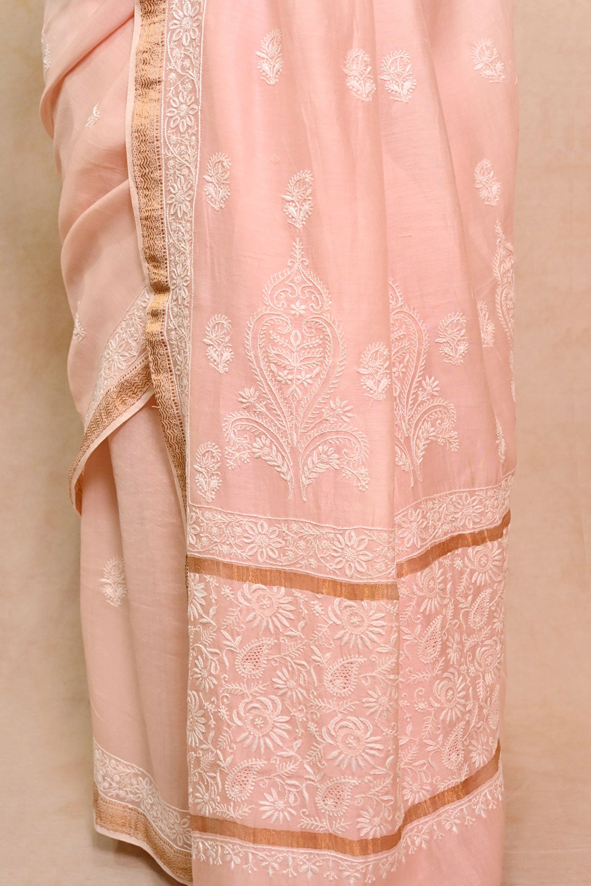 Light Peach Chanderi Chikankari Saree with Zari Border