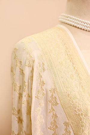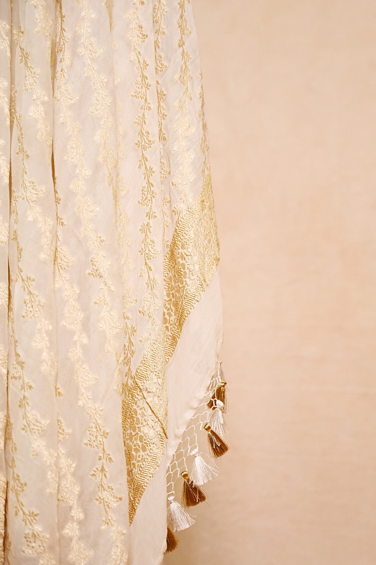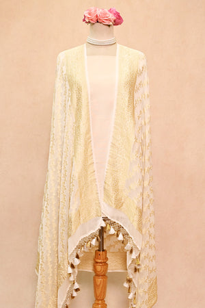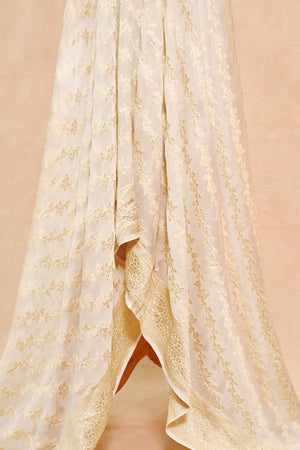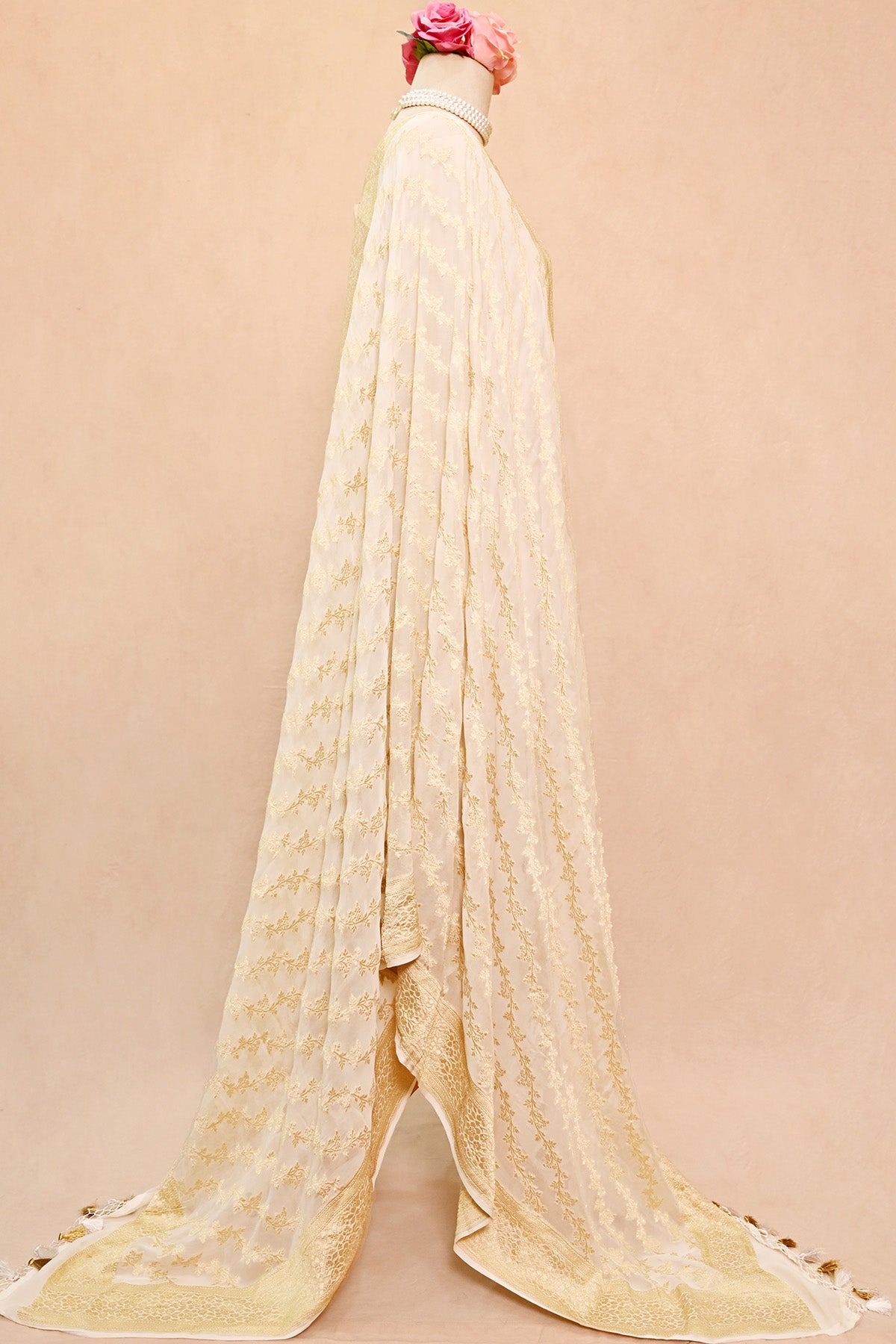 Off White Khaddi Georgette Banarasi Dupatta with Floral Stripes