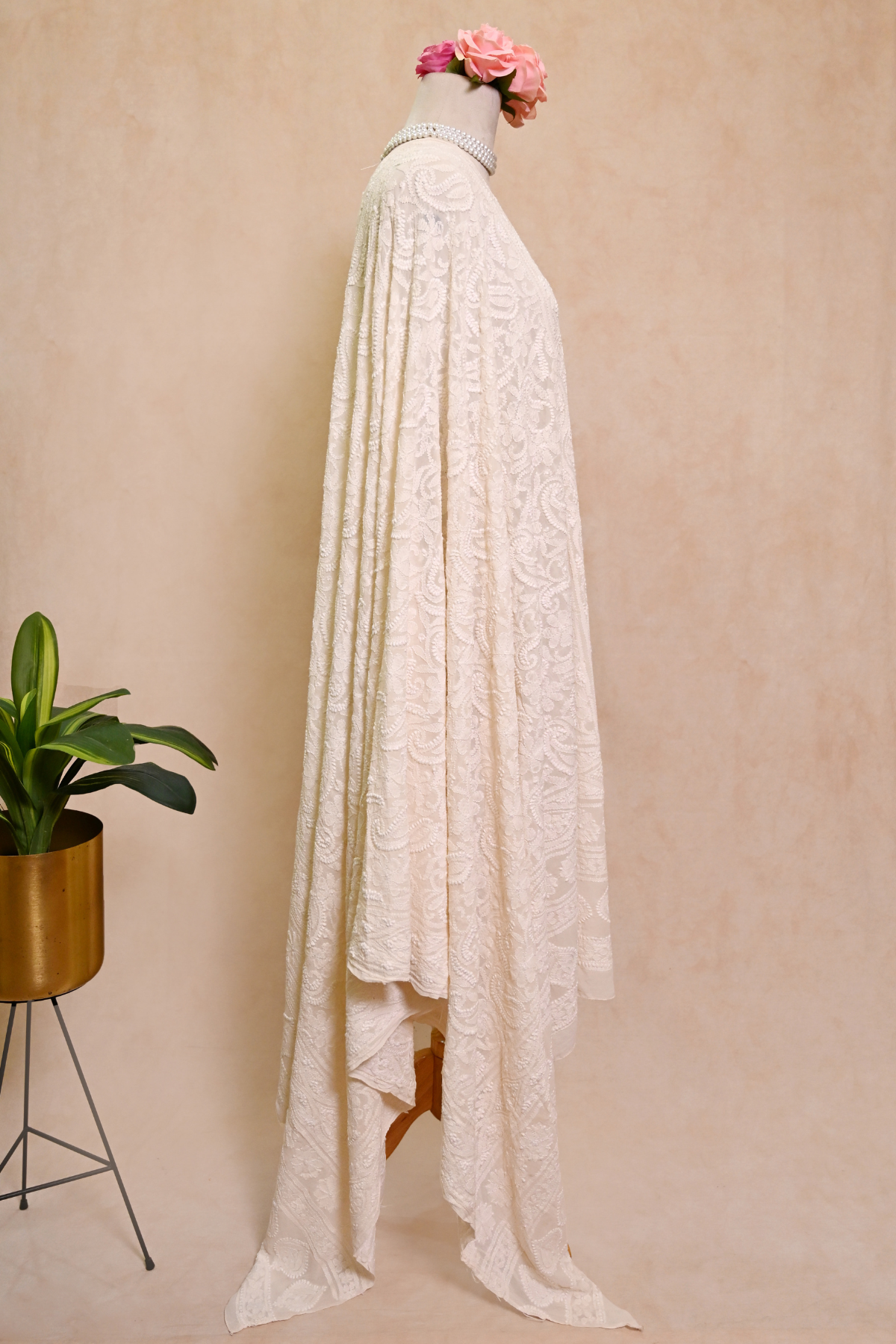 Drape yourself in timeless elegance with this beautifully handcrafted Chikankari Georgette dupatta. The highlight of this piece is the classic paisley motifs outlined with fine keel work. Featuring intricate, heavy all-over embroidery, it reflects exquisite craftsmanship and artistry, making it a true heirloom creation.