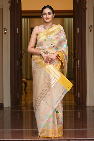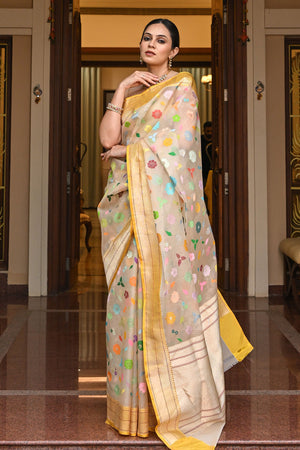 Organza Silk Banarasi Saree with Colorful Floral Motifs