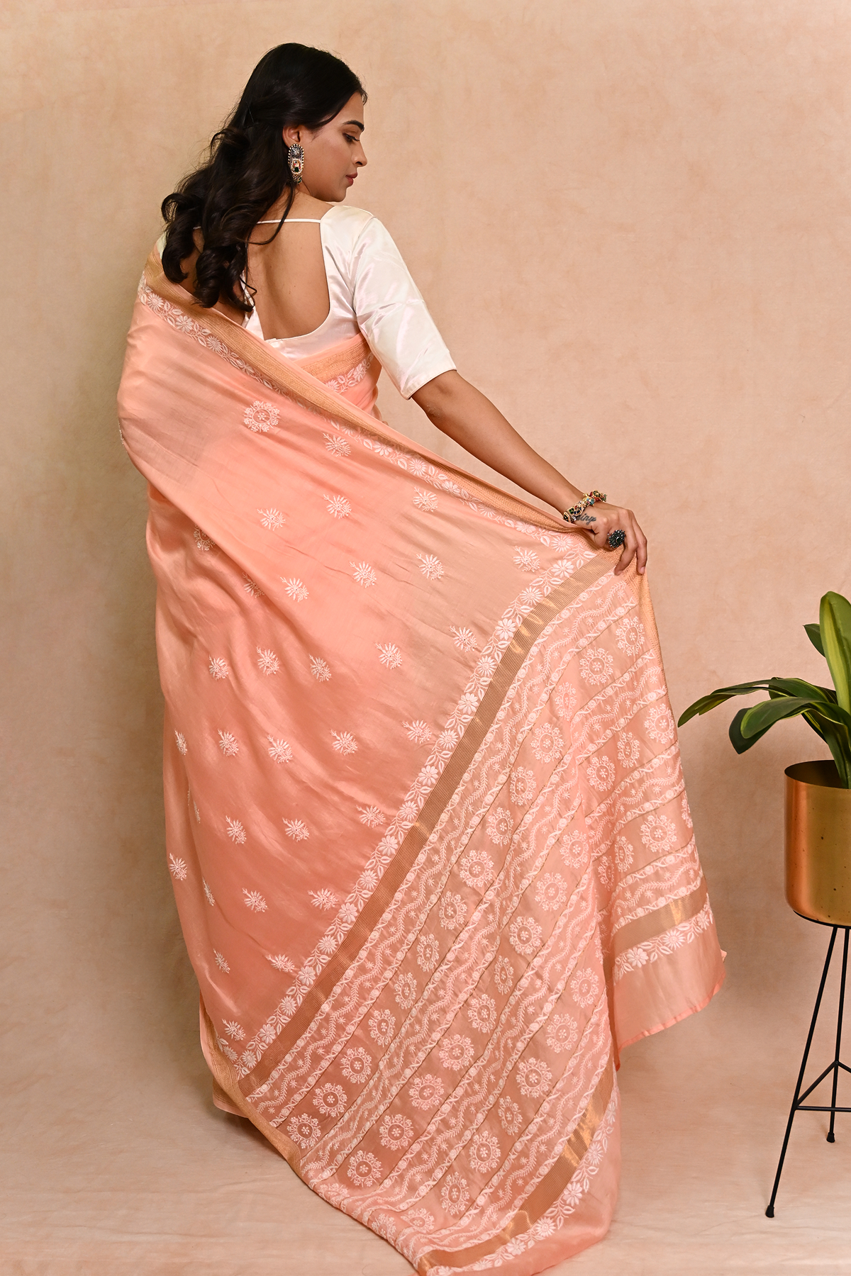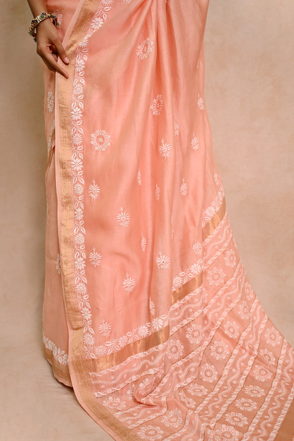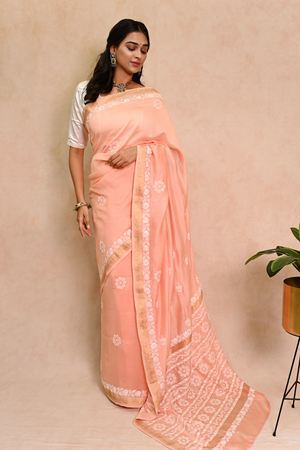 Peach Chanderi Chikankari Saree with Zari Border
