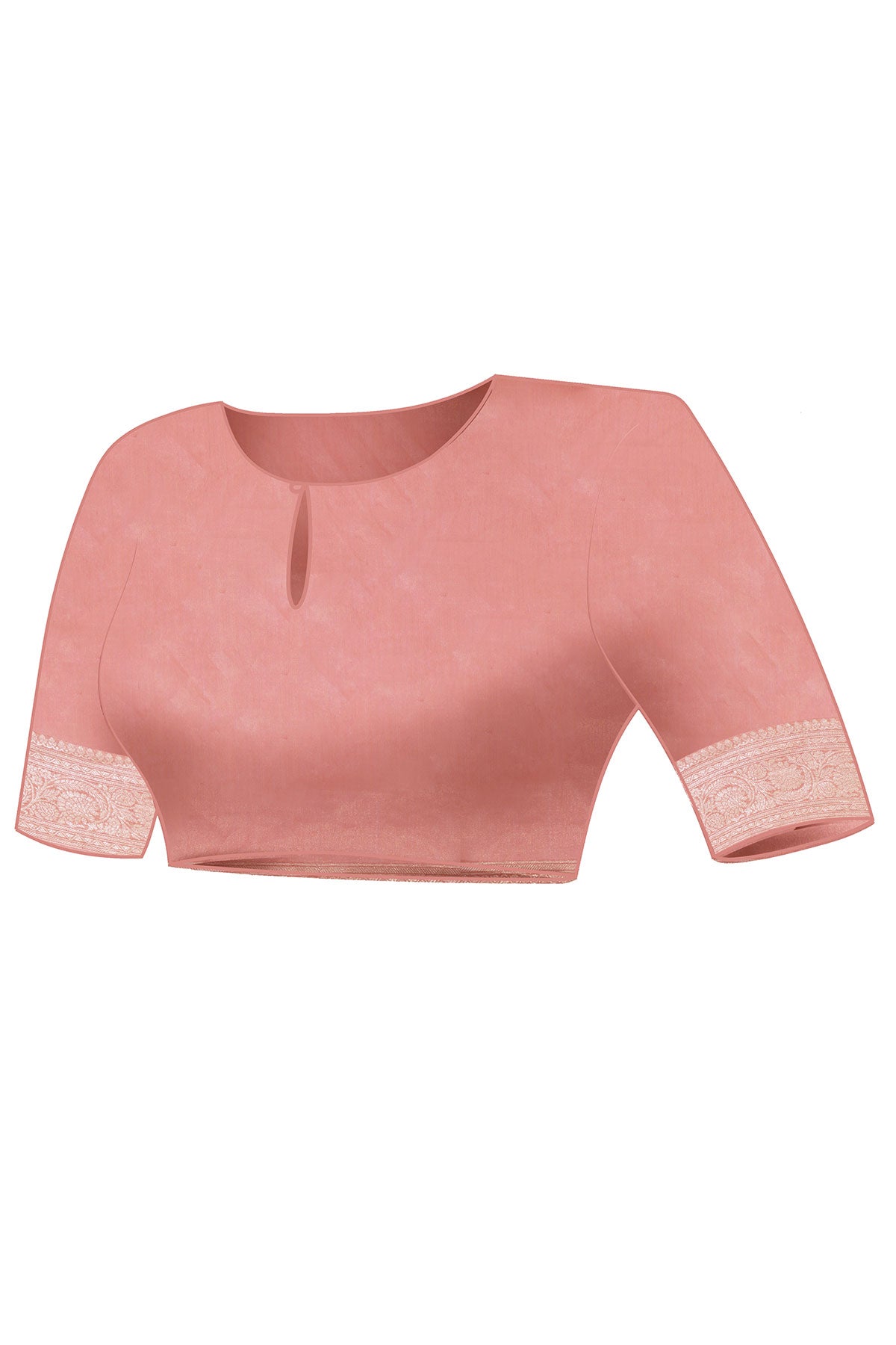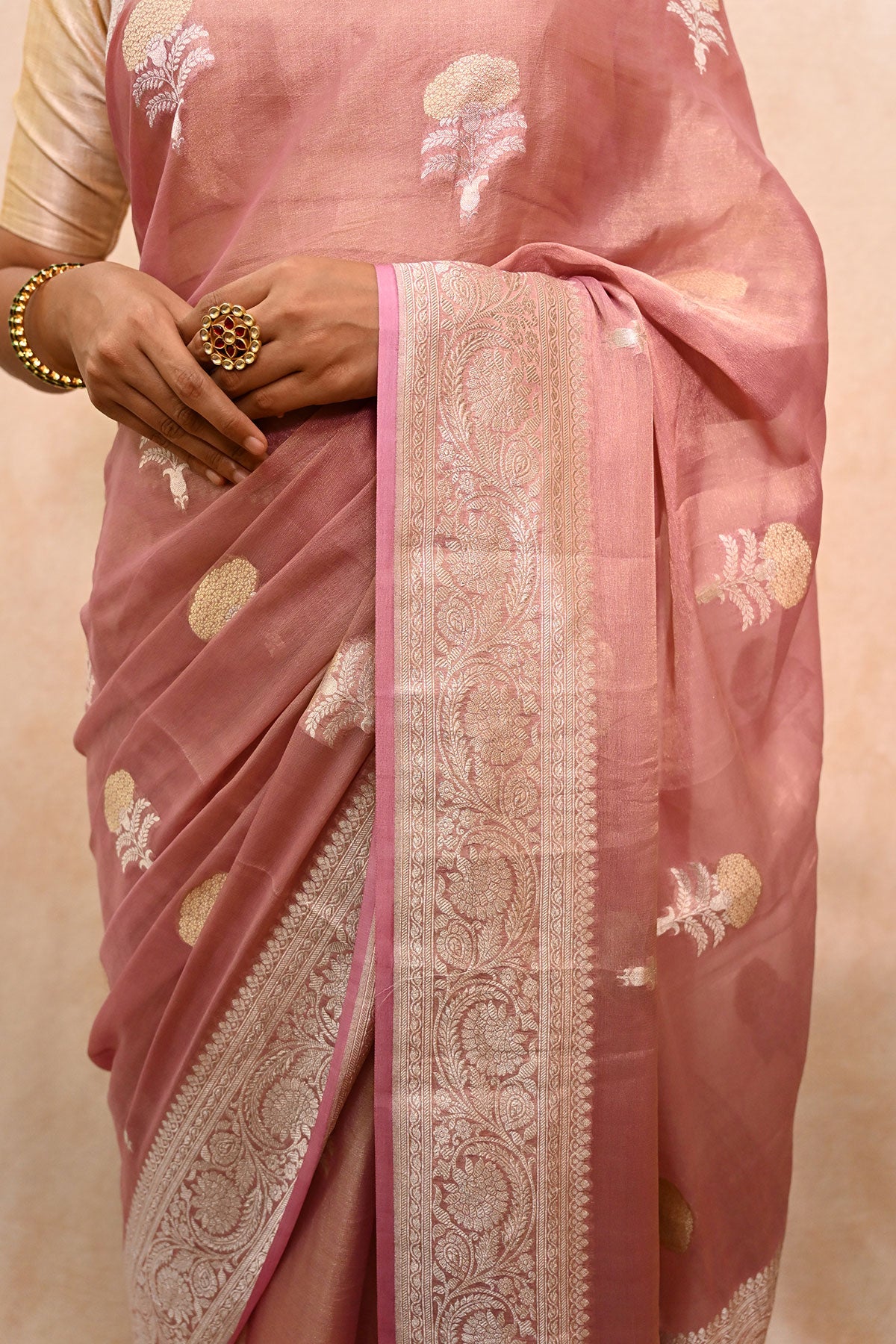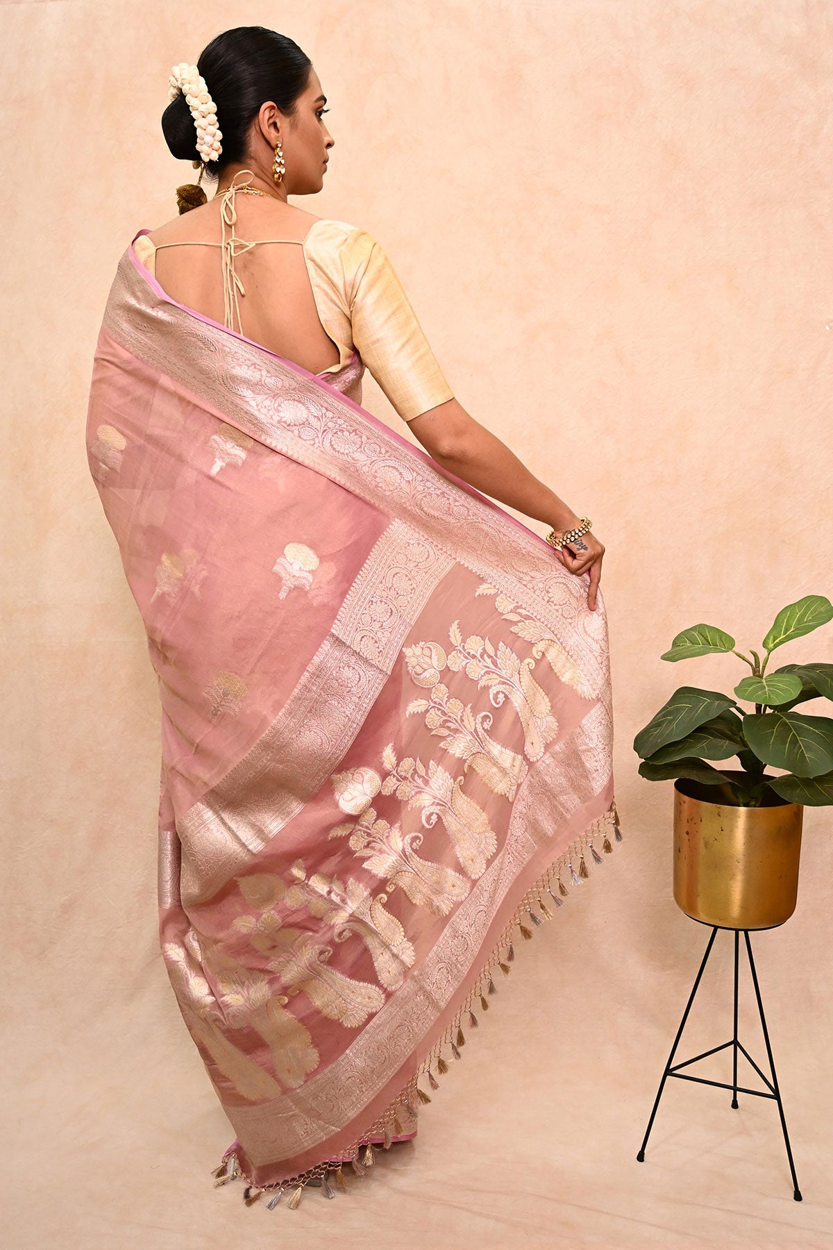 Elegant and ethereal, this dusty pink Banarasi saree in pure georgette tissue features intricate Alfi work across the saree body. The design is enhanced with a beautifully woven border and finished with zari tassels, adding a soft shimmer and festive charm. Crafted using the cutwork technique, it’s a timeless piece for graceful occasions.