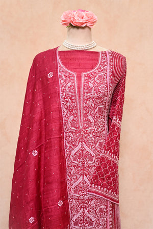 Rose Red Tussar Silk Chikankari Suit